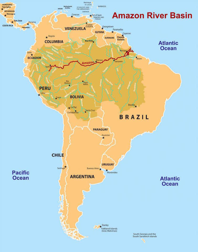 de Amazone is de op een na grootste rivier van Zuid Amerika. Deze loopt van Peru via Brazilië naar de Atlantische oceaan. De rivier heeft veel vertakkingen en zijstromen. Het klimaat rondom de rivier is tropisch en zonder duidelijk droog seizoen. De gemiddelde tempratuur is ongeveer rond de 30 graden en per maand valt hier ongeveer 100-200 mm regen.